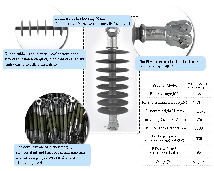 | Specification | Rated Voltage:35kv Rated Bending Resistance Load:6kN Structure Height:450mm Leakage Distance:950mm |