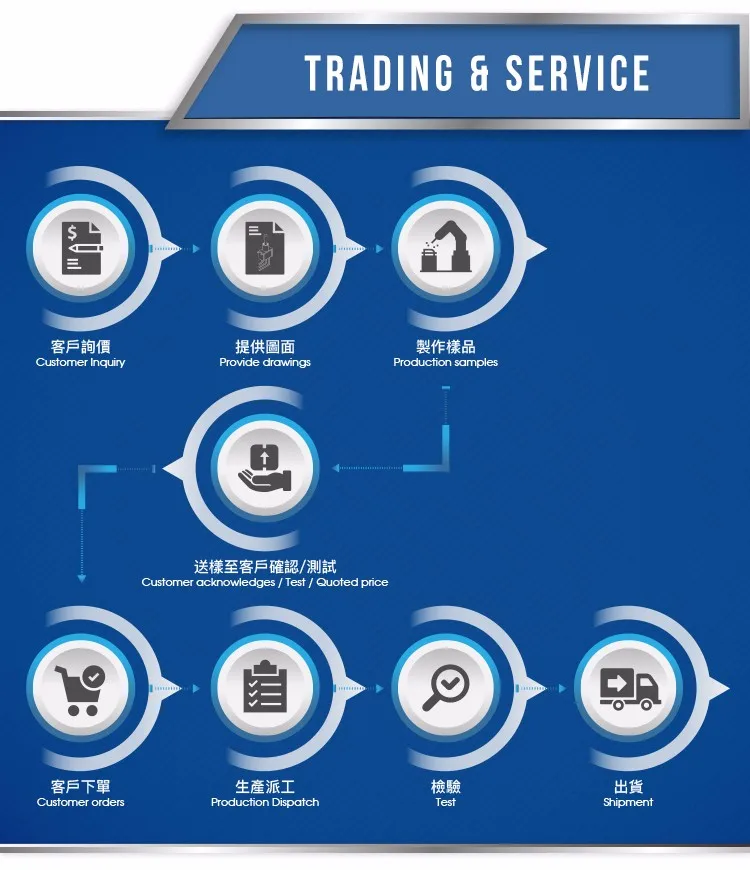 From the purchase of raw materials to the finished product, all production process (product development/plating/mold and equipment processing/ metalpressing/ plasticinjection/semi-automatic and fully automated equipment assembly, etc.) are completed in the factory.