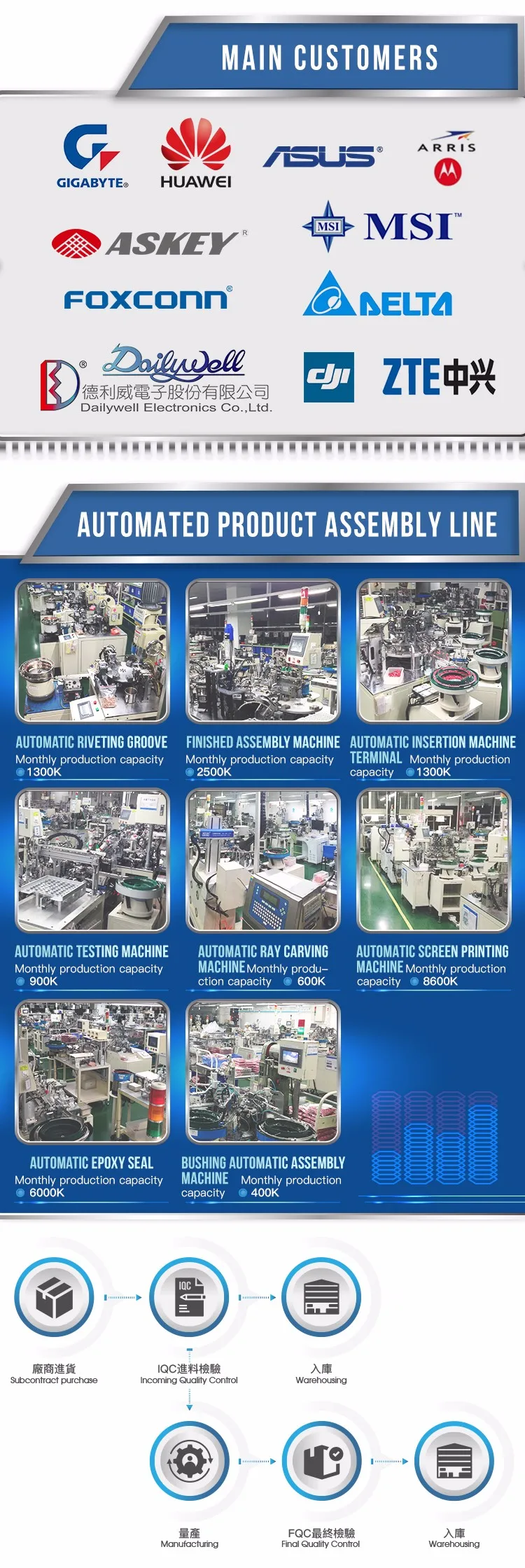 Dailywell Electronics Co., Ltd., whether in production base or in quality assurance department in the head office, have professional equipment and technical personnel. In addition to the annual new product development, product improvement and testing are performed as annual plan to ensure that listed products maintain in best quality. Therefore, our long-term customers/partners, get the best quality of the switches.