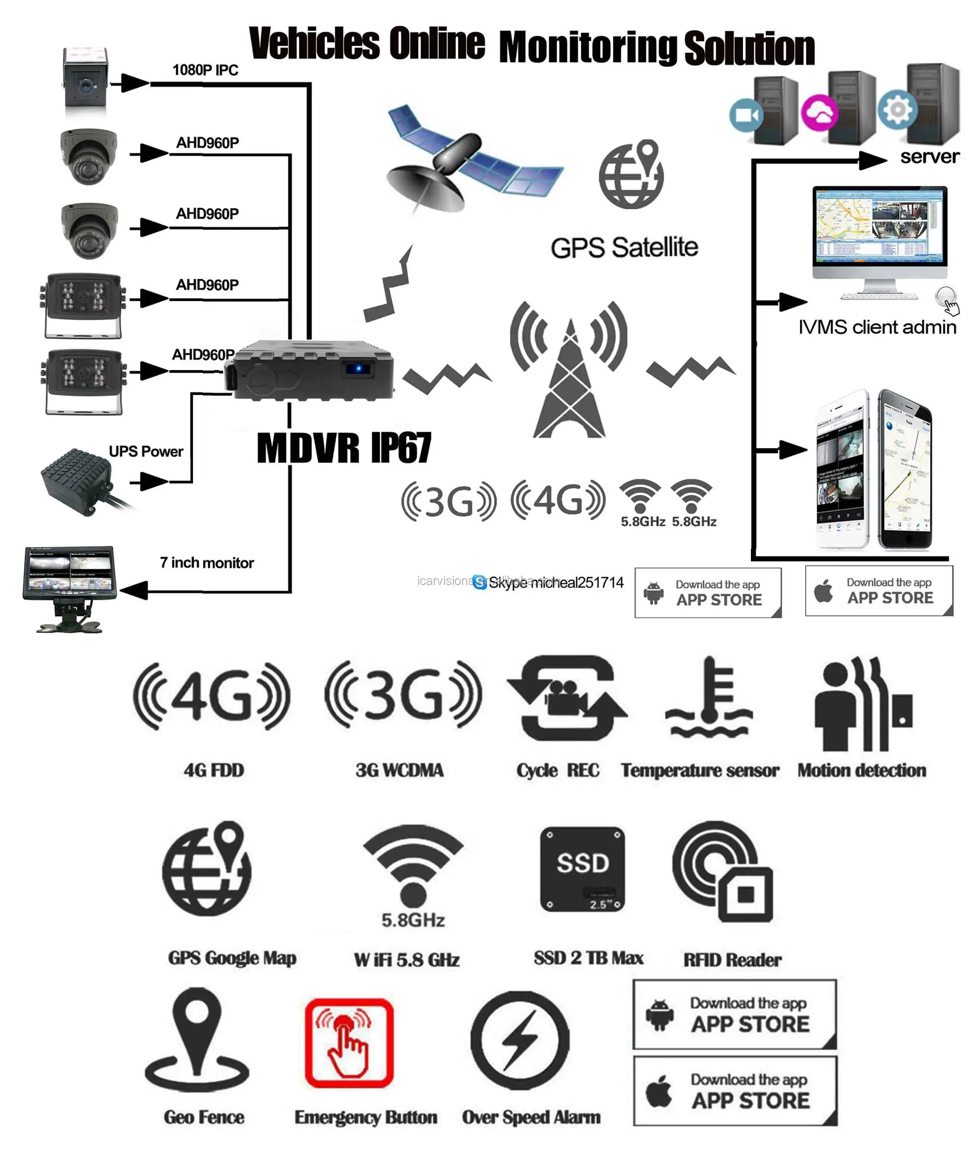 | IVMS | Wireless (require Wi-Fi or cellular Option) real-time A/V monitoring, GPS, alarms, etc. | |
