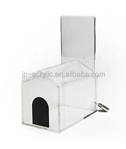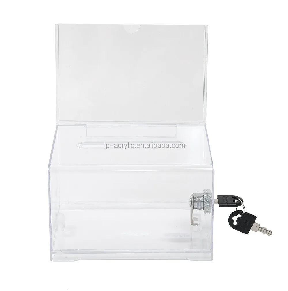 This clear suggestion box with a locking mechanism and includes a set of two keys. Each donation holder is made from acrylic and includes pre-drilled holes for wall or tabletop mounting. Each locking suggestion box has a slotted lid for easy deposits of suggestions or votes. Many businesses use the unit as a donation holder for office coffee funds, small charity initiatives, and more. Alternatively, the acrylic container is also great for depositing raffle tickets and contest entry forms. The suggestion box features a set of two keys, so that users can feel secure leaving the contents of this suggestion box unsupervised. Each unit includes all the hardware needed to secure the holder to a tabletop or wall.