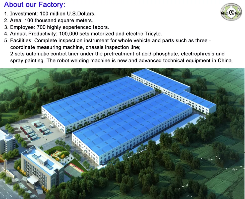 Our tricycle factory has 20 years experience in motorcycle manufacture field. Now it occupies total investment 100 million US.dollar and area 1000 acre.