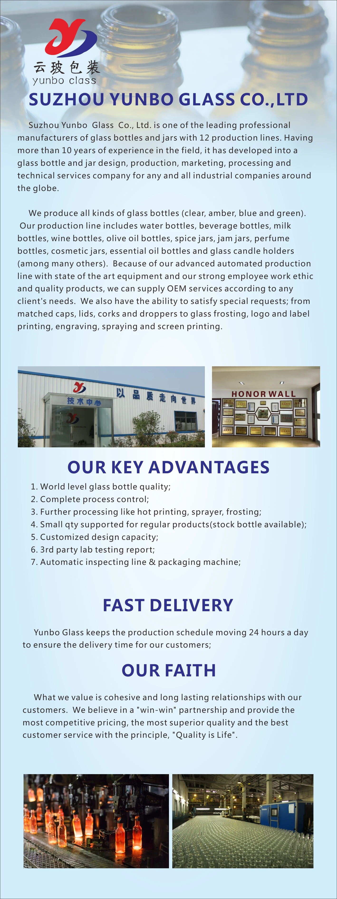 Established in 2004,Suzhou YunboGlass Co., Ltd. is the leading professional manufacturer of glass bottles and jars in China. Having more than 10 years of experience in the field, it has developed into a glass bottle and jar design, production, marketing, processing and technical services company for any and all industrial companies around the globe.