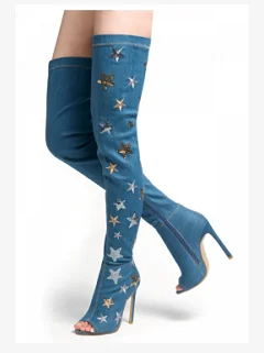 blue denim boots Over the knee Cut-out women Long Boots High Heels Sexy Thigh High Boots Jeans Denim Rome peep toe Sandal