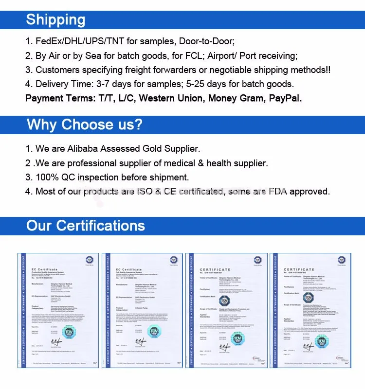 Company Information: 1. Professional: 11years professional supplier of medical & health supplier. Providing service to the customers from over 130 countries. 2. Quality Assurance: CE and ISO certificates for quality assurance 3. Competitive price: We always ensure high price performance to benefit our customers. 4. OEM available& Fee sample & Small order acceptable. 5. Timely Delivery: Your order shall be shipped once finished. 6. Main products: Medical Consumables, Medical Equipment, First Aid Kits, Dental Products, Healthcare Products, Veterinary and Pet Products, Laboratory Products, Ungrouped, etc.