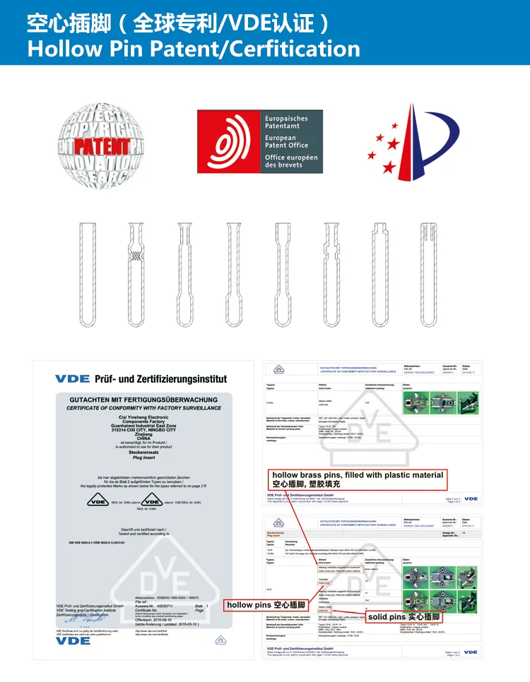 Our Plug Inserts, with Hollow and Solid Pins, approved VDE, UL, TUV, etc., and correspond to RoHS and REACH.