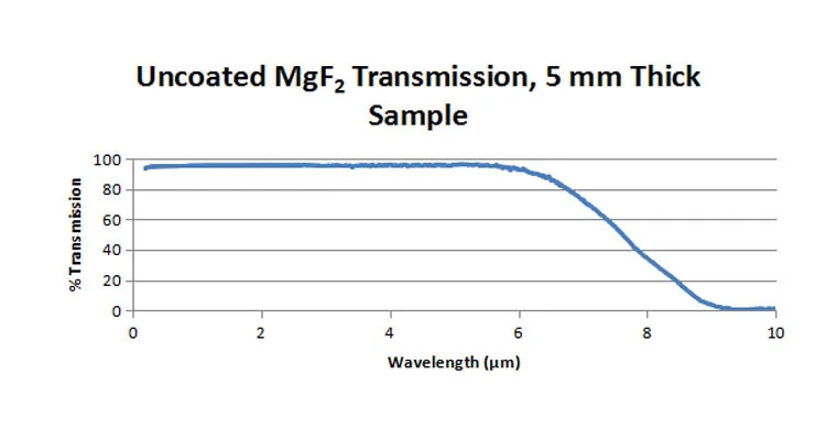 MgF2 windows are well suited for deep-UV applications, even extending into the vacuum-UV region. They offer >50% transmission at 120 nm, making them suitable for use with excimer laser systems, as well as applications involving the Hydrogen Lyman-α line at 121 nm. Thorlabs' MgF2 windows are also usable in the UVA, UVB, visible and IR ranges, with approximately 94% transmission from 200 - 1000 nm, and approximately 95% transmission from 1 - 6 µm.