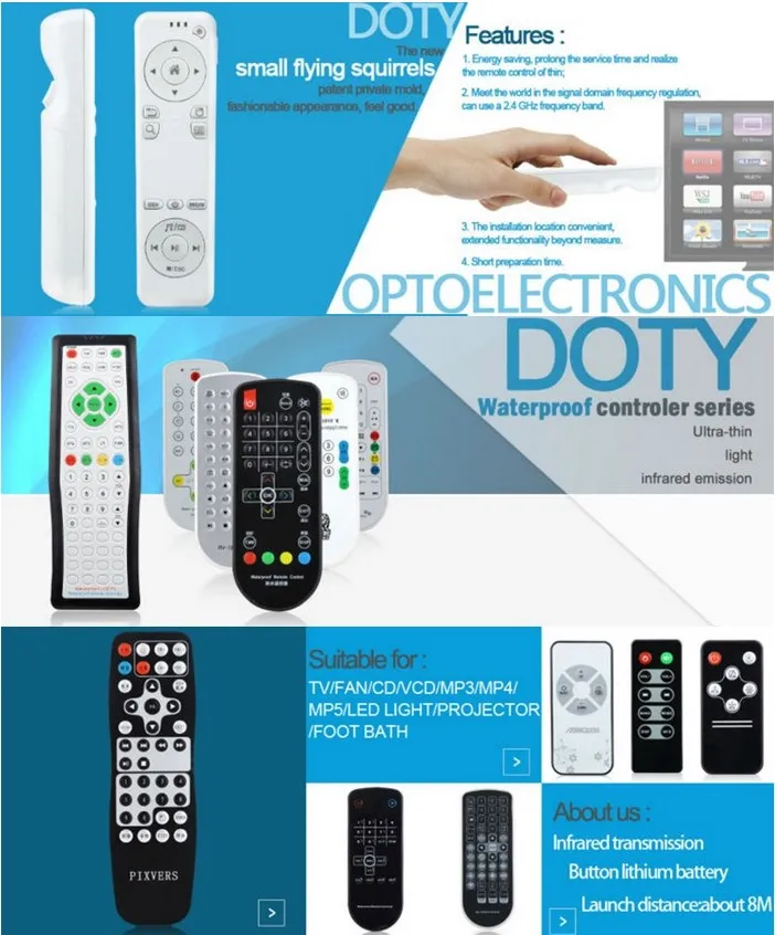 Doty Photolectric Co., Ltd. is a experenced manufacturer of remote control with well-equipped testing equipment and strong technical force.Our company has a system of teams,design,produce,salesand after sales-services as a whole. We have sold all kinds of remote control to Southhern Europe,Oceania,Northern Europe,Western Europe,Eastern Europe,South America,North America,Central America,Eastern Asia,Southest Asia,Mid East.