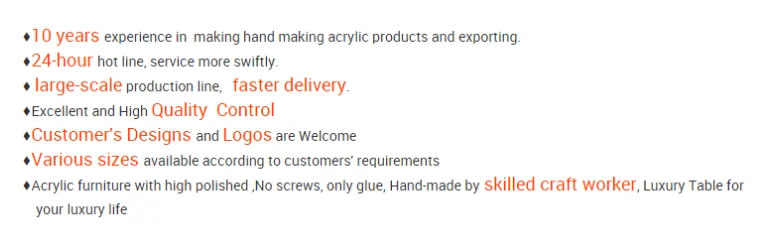 We are the Professional Factory for Acrylic Furniture, Acrylic Table, Acrylic Chairs, Acrylic Stools, Acrylic Bar Stools and acrylic accessories. high quality and inexpensive. Your design are welcome.