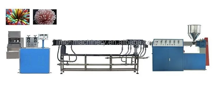 This machine using polypropylene as raw material, with the use of masterbatch, after melting, extrusion, shaping, cooling, pulling, cutting, then produce transparent, one color, two color and three color drink straws. It is composed of main body, tooling, cooling system, cutting machine, with a variety of models such as single color extrusion line, two color and two color co-extrusion line, three color extrusion line, etc.