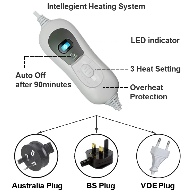 Feature | 1. 3 heat settings with LED indicator 2. Auto off in 90 minutes 3. Plush fleece liner is removable and washable 4. Fast heating and overheaitng protection 5. RoHS/REACH test |