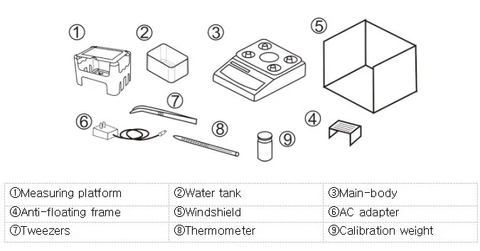 Measurement Procedure | Step 1.Place sample on test board to measure weight in air,and then press MEMORY button to memory. Step 2.Place sample on nacelle in the water. Press MEMORY key to memory. The testing procedures of porous materials please refer to the random instructions | ||||||