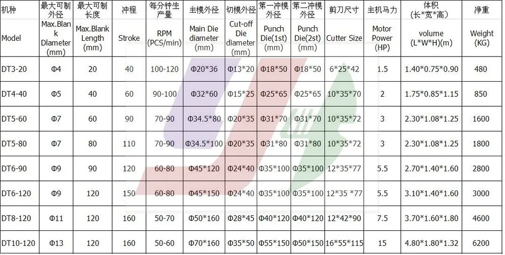 (1). The machine belong to the cold heading machine, the function is the first molding and the second punching products, which is mainly used for forming the heads of the screw products, the work principle is line materials calibration, accessing lines, sending materials to the main mold, first punching initial forging, and second punching the formed blank materials and withdraw. The work gets done without any letup, the production capacity can be up to about 150-180pcs per minute, which belongs to the more advanced products in the current technology.