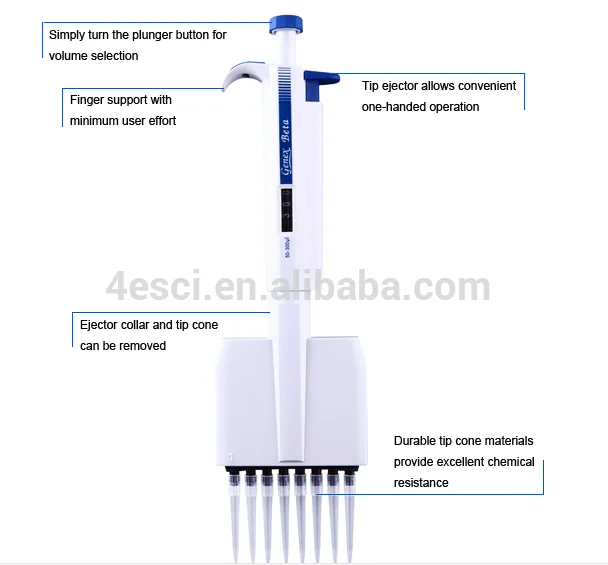 Four E’s Scientific pipettes are for general purposes of accurate and precise sampling and dispensing of liquid volumes. They work on the air displacement principle and use disposable tips. All our pipettes have been quality tested according to ISO8655. The quality control involves gravimetric testing of each pipette with distilled water (grade 3, ISO3696) at 22°C. The Genex series have 8 sizes of Single Channel and 6 sizes of Multi Channel.