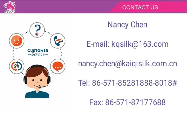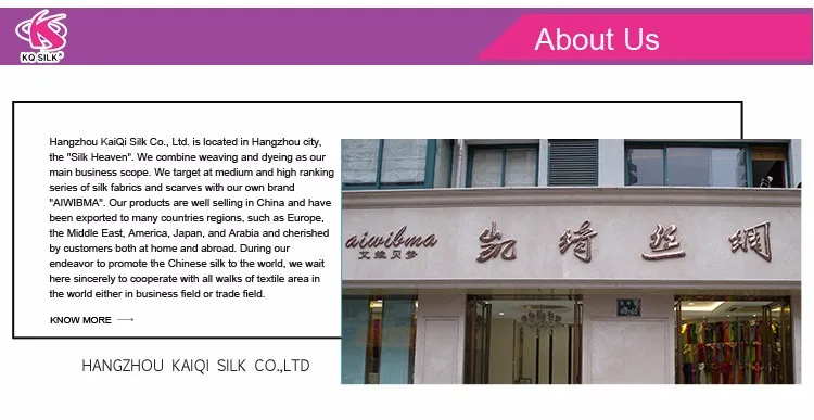 Hangzhou KaiQi Silk Co., Ltd. is located in Hangzhou city, the "Silk Heaven". We combine weaving and dyeing as our main business scope. We target at medium and high ranking series of silk fabrics and scarves with our own brand "AIWIBMA". Our products are well selling in China and have been exported to many countries regions, such as Europe, the Middle East, America, Japan, and Arabia and cherished by customers both at home and abroad. During our endeavor to promote the Chinese silk to the world, we wait here sincerely to cooperate with all walks of textile area in the world either in business field or trade field.