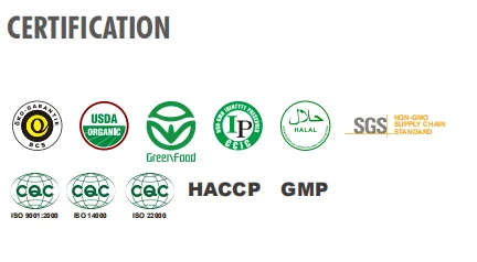 Certificates: BCS Organic. Non-GMO. Halal. FSMC. USDA. QMSC.