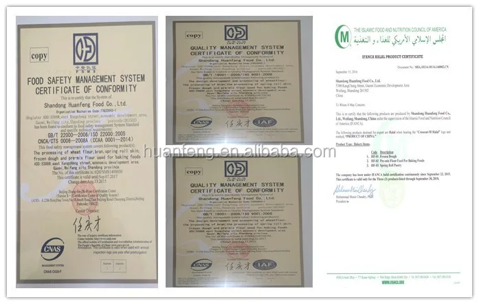 Shandong huanfeng Food Co., LTD is a leading frozen foods manufacturer and flour milling company in China. We provide high quality products, including frozen spring roll pastry, Frozen spring Roll Pastry(threadiness),frozen Taiwan pancake(paratha), frozen deep-fried dough sticks , Buckwheat Flour, Fried chicken powder and bread mix with natural yeast etc., to our domestic and oversea clients with well-known brand "Huan Feng ".