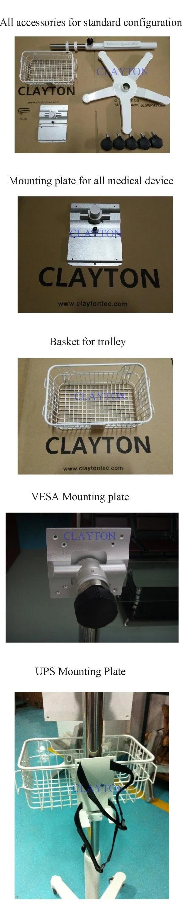 Provide mobile mounting solution for various medical devices, including patient monitor, fetal monitor, defibrillator, infusion pump etc. Please contact Clayton for appropriate solution.