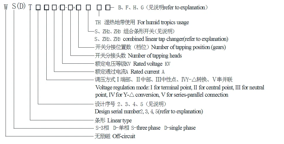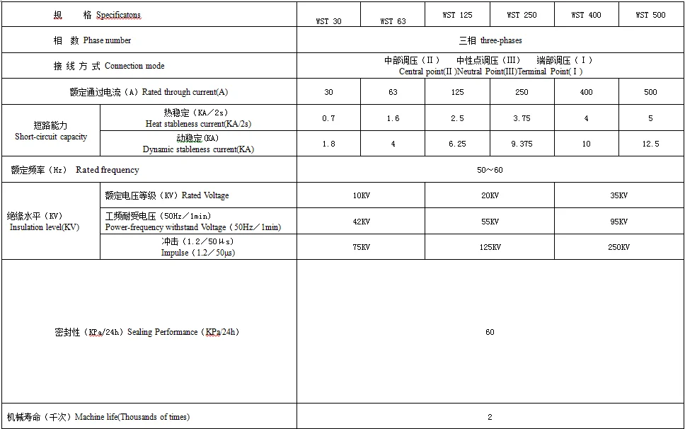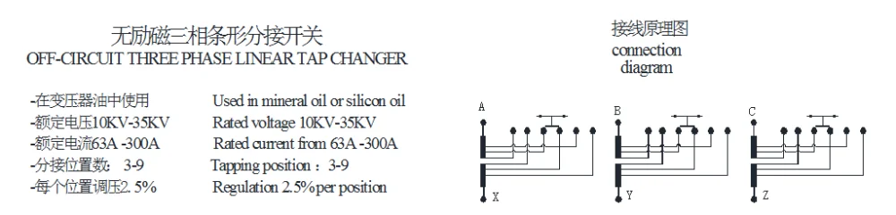 current of 30A~500A; the voltage-regulating mode are: central point, terminal point, neutral point which can be directly fixed on the tank cover of the transformer, exchange under the off-circuit condition.