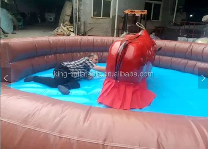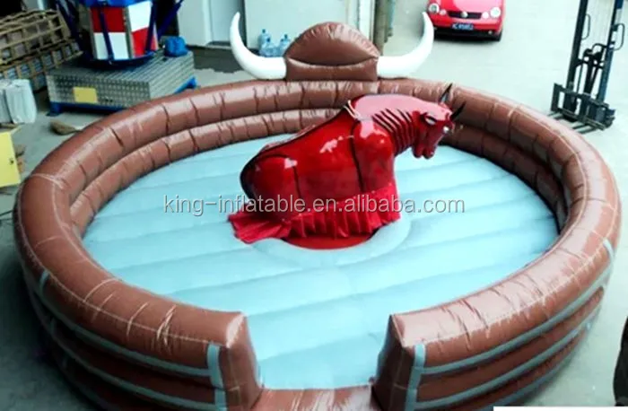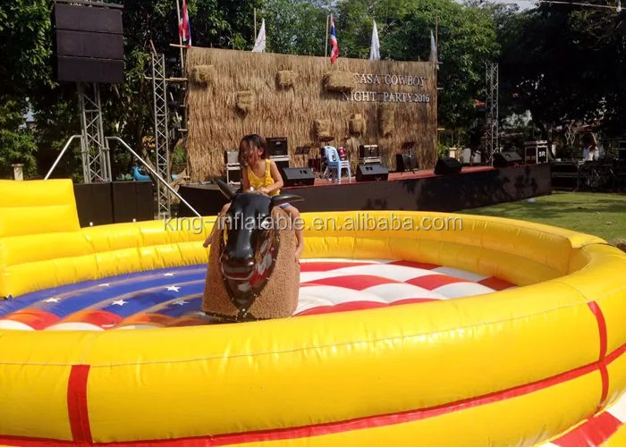 Meanwhile, you need not worry about you will get hurt when you falled down from the bull, it have environment friendly inflatable mat around the bull, it is soft and durable, enough to protect people. the inflatable mat made of 0.55mm PVC material, they are more durable and soft.