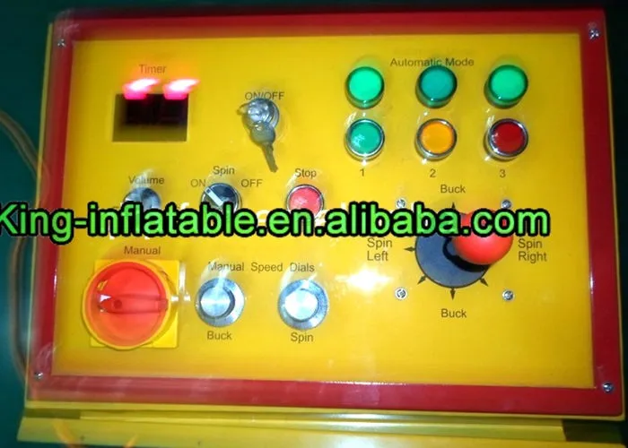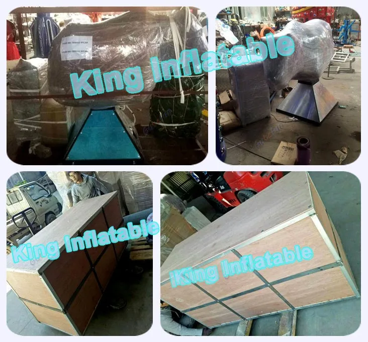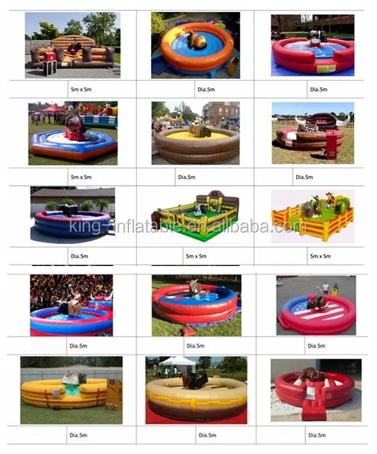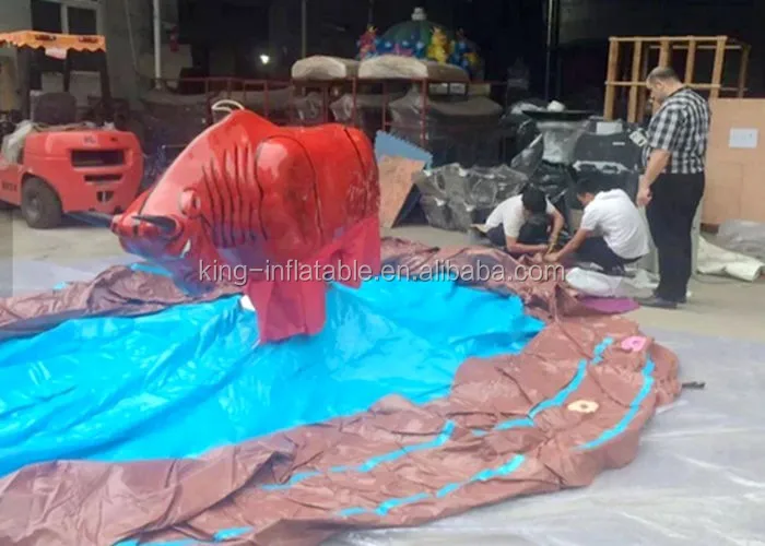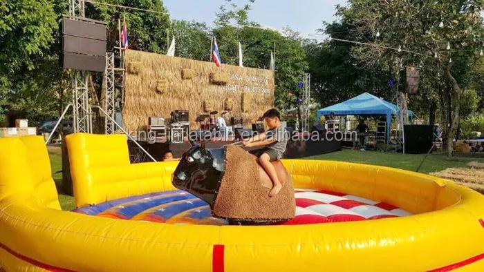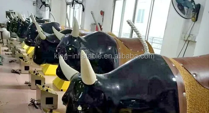 Material | Inflatable ground mattress are produced by water proof and fire retardant 0.55/ 0.6mm Plato PVC . The best design inflatable mechanical rodeo bull body are produced with Fiberglass and stainless steel |