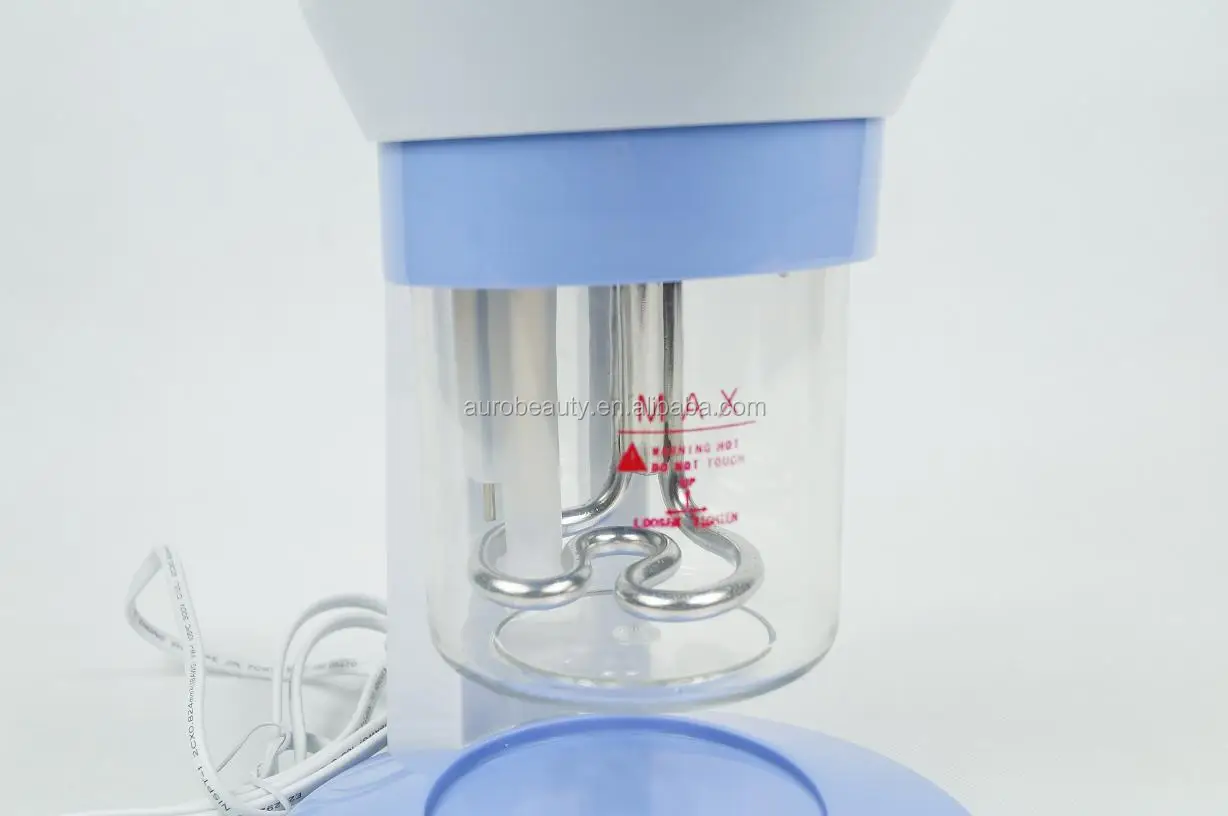 | Facial treatment operation: | 1. Put the steamer securely on the table, add water and connect to the mains power supply. 2. Rotate the spray tube to a comfortable angle.Dip some aroma by tampon then put it into the aroma hole (as you like). 3. Press the steam On button. After about 4-5 minutes the water boiled. Press UV light On button when you are ready to steam. 4. Begin facial treatment. 5. Remember the safety distance is 30-50cm from the spray hole, so that your face won’t get too hot. 6. Normally 5-15 minutes treatment would be enough, 3-5 minutes for sensitive skin. Maximum O3 sterilizing is 5 minutes. 7. When treatment has finished, turn off the appliance.