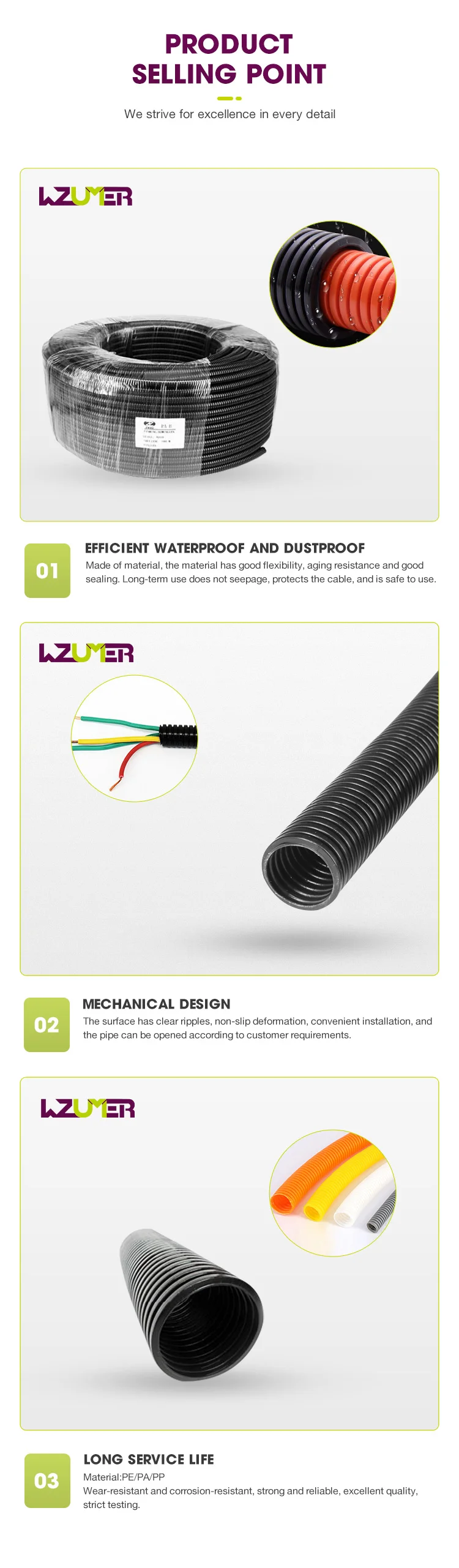 How to use: | Insert the wires and cables into the pipe and fit respective types of ZHDG:SM-G SM AND SM-F series flexible joints before using. |