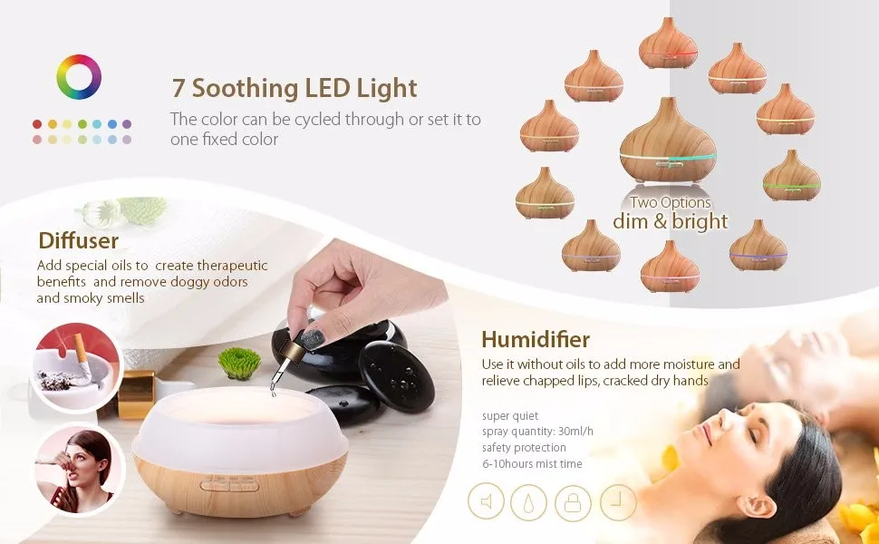 Form and Function: Modern and simplistic design to match your room decor; 5-in-1 mutifunction: aromatherapy diffuser, humidifier, air purifier, ionizer, and LED color changing night light.
