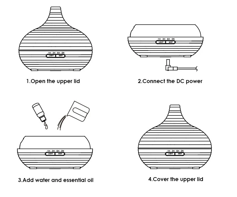 4 SETTING TIME, 2 MIST VOLUME LEVEL AND 7 CHANGING LED LIGHTS: 1H/ 3H/ 6H/ ON (continue working) timer; Strong/ weak mist level; 7 color changing lamps can also be fixed one color.