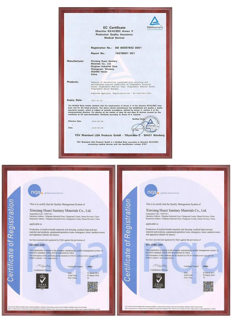We have passed GMP, the ISO9001:2008, ISO13485:2003 international quality system and CE certificate. Our products are medical consumables for single use, which consist disposable non-woven products, like sterile surgical gown, face mask, surgical drapes & wrappers and underpad, and surgical pack, for example wound dressing pack, delivery pack, obstetric pack etc.