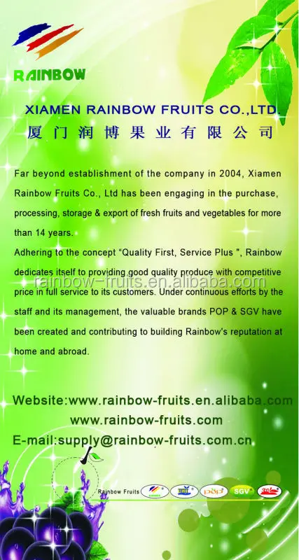 Packing standard: | Yunnan Red grape: 1)N.W.8kg/plastic box, loose packing 2)N.W.8kg/foam box, 6~7samll bag/foam box 3)N.W.9kg/foam box, loose packing Xinjiang Red grape: 1)N.W.6kg/plastic box, loose packing 2)N.W.7kg/plastic box, loose packing |