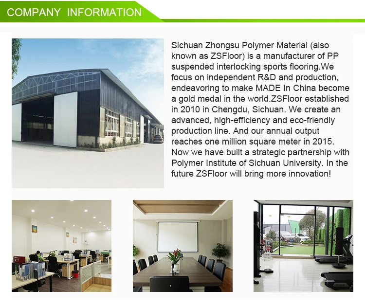 ZSFloor interlocking flooring tile main material is Modified polypropylene(PP) and other materials include Color Master Batches, Thermoplastic Elastomer,UV-Resistance Material, which make ZSFloor products have a good performance of anti-uv and anti-aging than other tiles in the market. They aren't glued or nailed to the subfloor, but merely sit on top of it. Floor trim holds down the edges. Start with a firm, solid and clean subfloor of any flooring material other than carpeting. ZSFloor interlocking flooring tile is applied for multi purpose sport court, basketball court, volleyball court, handball court, tennis court, futsal court, swimming pool, garage, kindergarten, backyard, outdoor events etc.