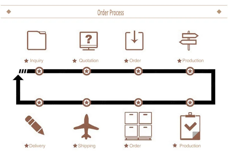 A: Send us inquiry--- receive our quotation—negotiate order details— confirm the sample—sign the contract—pay 40%deposit—mass production—cargo ready—balance/delivery—further cooperation.