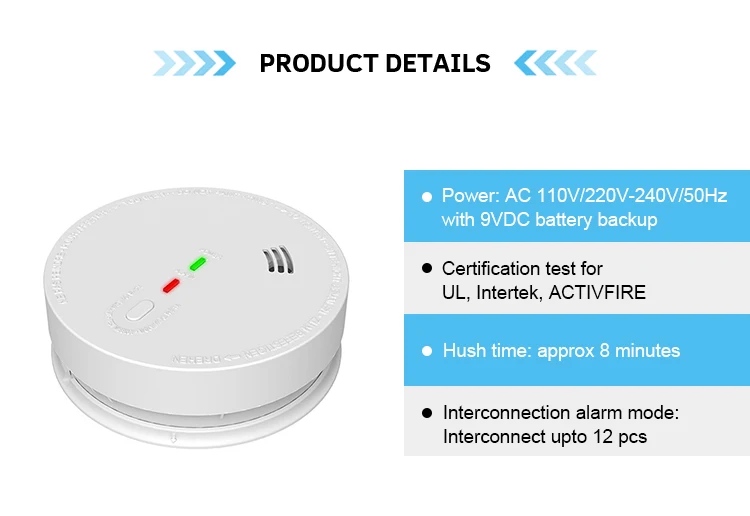 Indicator | Flash red LED and send one"BI" every 32 Seconds,Low battery signal | Special Function | Interconnection alarm mode Interconnect upto 12 pcs |