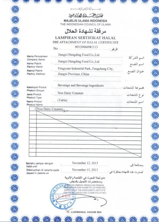 Jiangxi hengding Food Co., Ltd. is the national grain and non-dairy products for further processing the largest manufacturers, the annual output of more than 10,000 tons. Non-dairy creamer using advanced extrusion equipment and manufacturing processes, and experienced technical staff from the production. Has been the development of more than 400 employees, covering 200 acres, 150 million of fixed assets of high-tech enterprises. Company products sell well all over the country, exported to Europe, South America, Africa, Central Asia and Southeast Asia...
