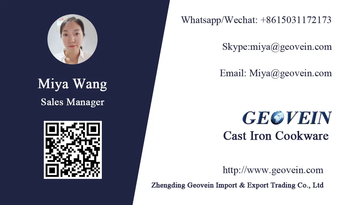 Geovein Co. has been specializing in all kinds of cast iron cookware ( including vegetable oil coating cookware, enamel coating cookware, cast iron skillet, cast iron fry pan, cook pan etc.) for more than 10 years. With the company developing and meeting the global market needs now we are doing the international business by ourselves.