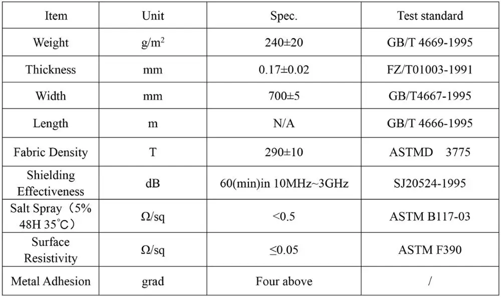 The product uses Polyester Taffeta as a substrate and is combined with copper and nickel mental layer, which has an excellent electrical conductivity and shielding effectiveness. The product can be processed into flame retardant conductive fabric laminated with thermo adhesive film with Flame Retardant Grade UL 94V0. It can be processed into EMI/EMC shielding conductive gasket etc, which is suitable for all kinds of EMI/EMC shielding, anti-static, ground connection, etc. The product is mainly applied to electronic manufacturing, communications and medical treatment industries.