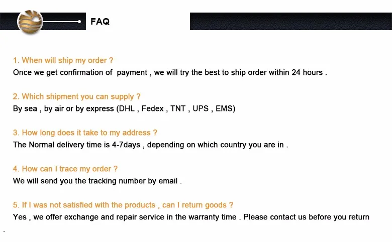 2.Supply 3 months warranty for the products from the date of arrival. Customer should check the items according to the order list after arrival. Contact with us and offer the data, photos of the problem items.