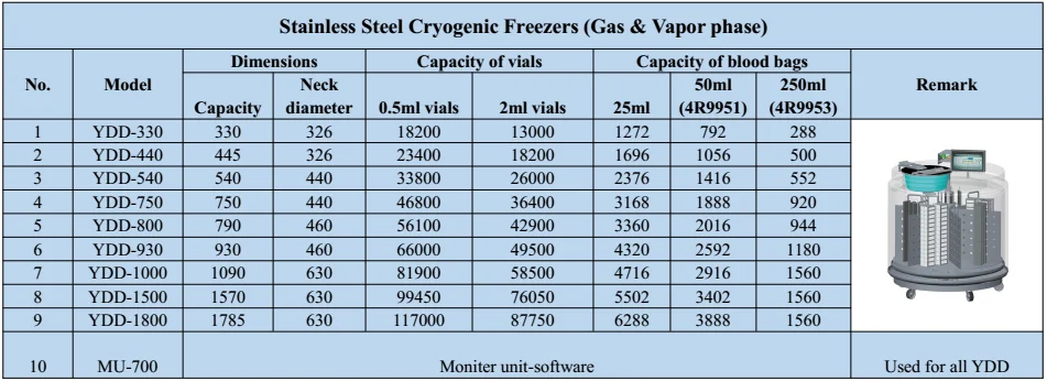 YDD series cryo-biological tanks are cryogenic biobanks, which provide the user with a fully automatic, safe and reliable cryogenic liquid nitrogen storage system. All tanks are made of high quality stainless steel, equipped with automatic caster wheel, brake device, convenient open hinged lid, and large diameter openings for sample storage. The sample can be stored in liquid phase (-196℃) or vapor phase (-190℃). Microcomputer touch control system provides greater convenience and security. In order to achieve the most economical operation, we design the biggest sample storage capacity under the condition of the minimum consumption of liquid nitrogen.