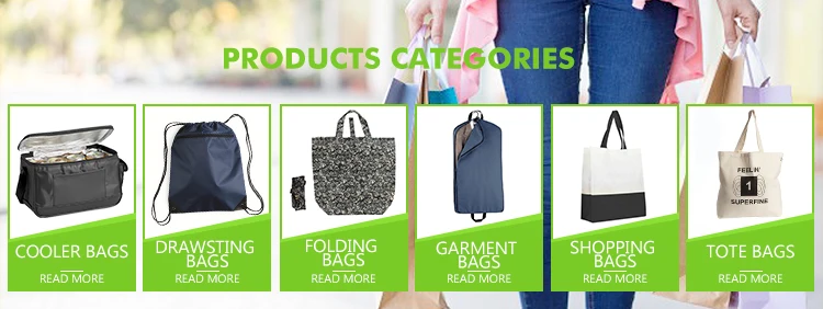 FEI FEI specializes in manufacturing shopping bags and garment bags made of non woven, polyester, nylon and other materials, including tote bags, drawstring bags, backpacks, folded bags, cosmetic bags, storage bags, ice bags, suit bags, dress bags and etc. Our current monthly production capacity is up to 5 millions pieces, which assures us to be capable of handling any large orders in a consistent bas