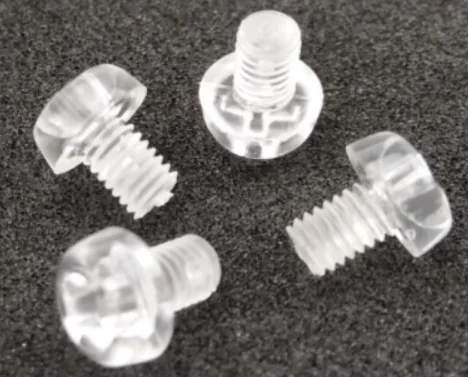 Plastic clear screws with round head phillips and slot drive machine threads , are made from plastic PC ( Polycarbonate ) . it is also called PC screws , micro M2 thread diameter and 4 length and widely used to electrical components and electronics .
