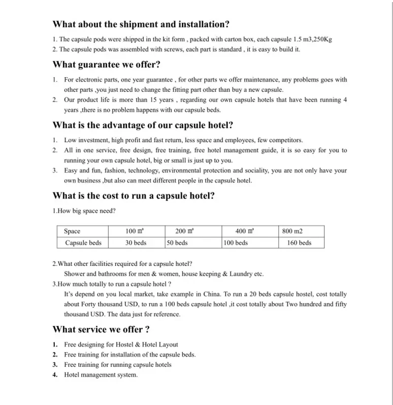 After sale service for the capsule sleeping beds and technical support for the capsule hotel management.