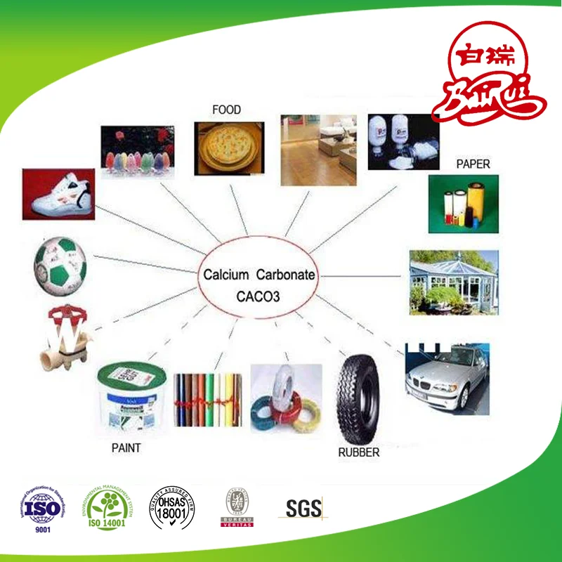 1)Rubber: it can reduce the amount of expensive natural rubber,increase its volume ,reduce costs, After adding calcium carbonate then can be obtain higher strength tensile ,tear strength and abrasion resistance than the pure Rubber vulcanizate