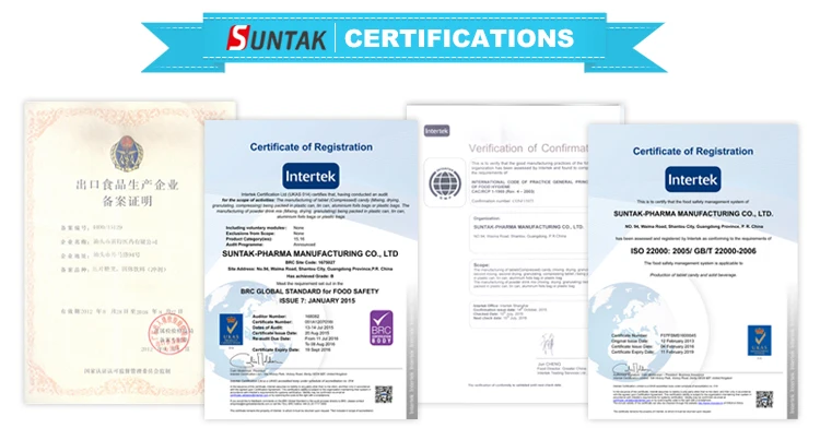 Aside of its own branded private label products for over 50 unique confectionery brands,our quality certificate on our facility GMP, ISO, BRC,QS,CIQ,SEDEX.Suntak Foods is certificated by international standards:GMP,ISO,BRC,QS,CIQ.