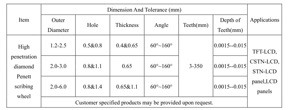 We could supply high penetration diamond scribing wheels (similar to Penett), micro teeth diamond scribing wheels, standard diamond scribing wheels, hybrid diamond scribing wheels, PCD axles, wheel holders, etc.