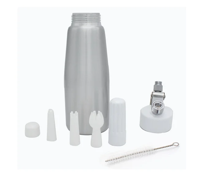 2.Featuring a one pint canister, aluminum charger holder and three decorating tips, this aluminum cream whipper is all you need to make your food creations look as good as they taste!