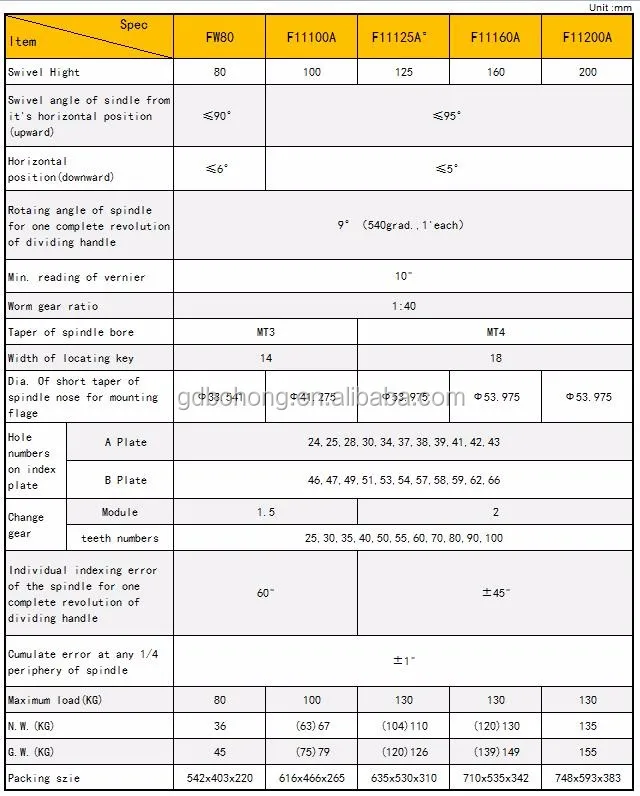 The universal dividing head has been designed to carry out all types of gear cutting.Precision dividing and spiral word with greater precision and efficiency than ever the dividing head can be tiled from a horiaontal position of 90-down to -10 from vertacil, and inclinations can be read off a scale graduated in degrees.The dividing head is built to highest engineering standards and tested to assure complete satisfaction.The ratio of worm to gear is 1:40,Universal index head can be used with milling,grinding,drilling machine for dividing.Universal dividing head is Most important attachment for milling machine,and F11 series is the most common univeral dividing head.