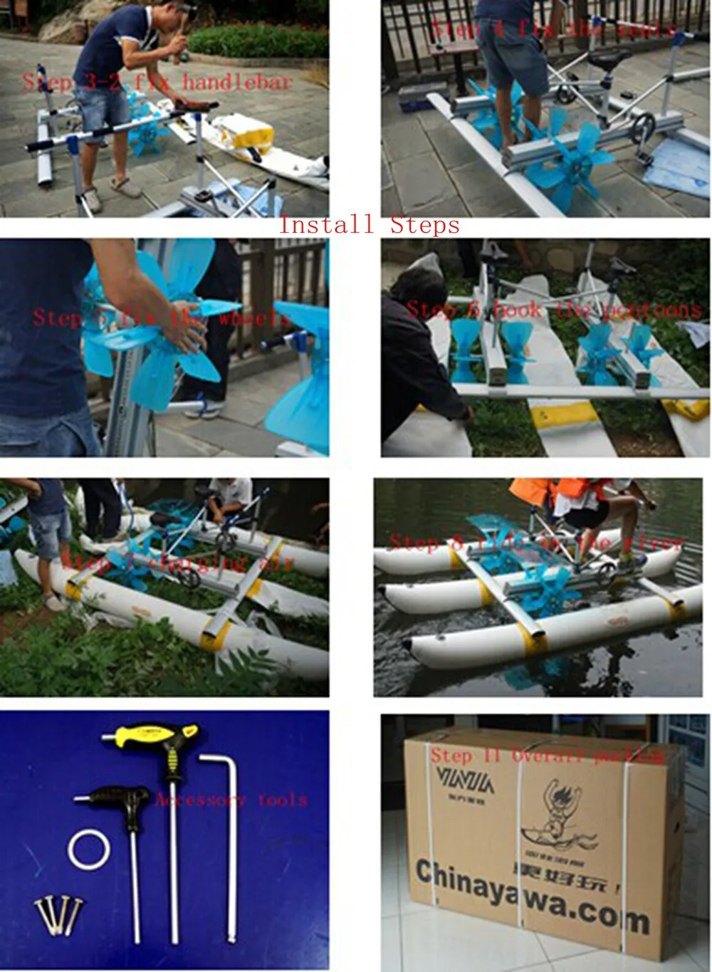 1.the water bike is 300*180*85cm, about 35 kg;