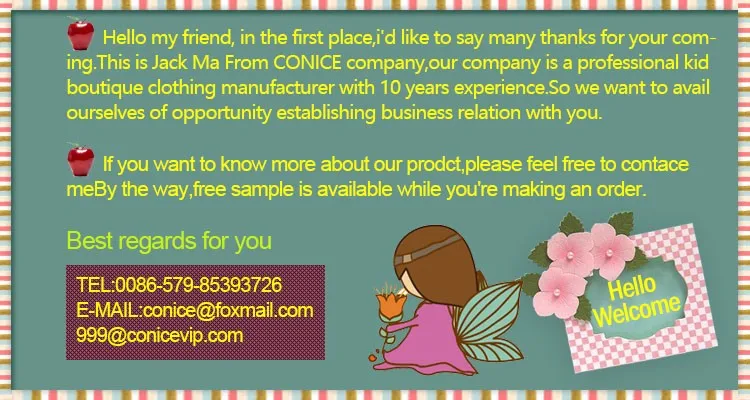 Established in 2005, Yiwu CONICE Kid Clothing factory is professional in manufacture industry of baby boutique