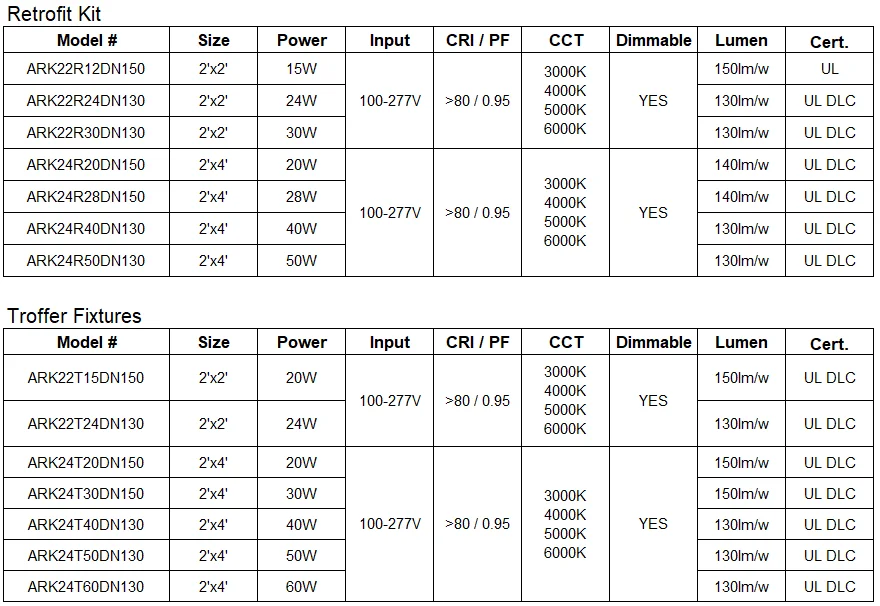 | 2x4 Troffer Retrofit | 1210 | 590 | 80 | 0.057 | 1 | 8 | 9.5 | 400 | 833 | 967 |